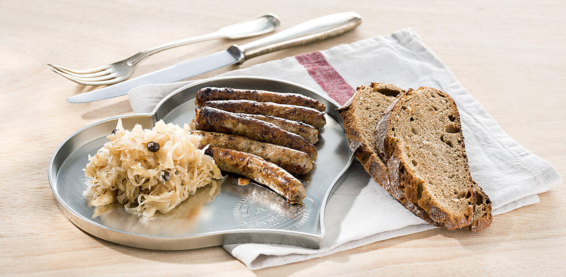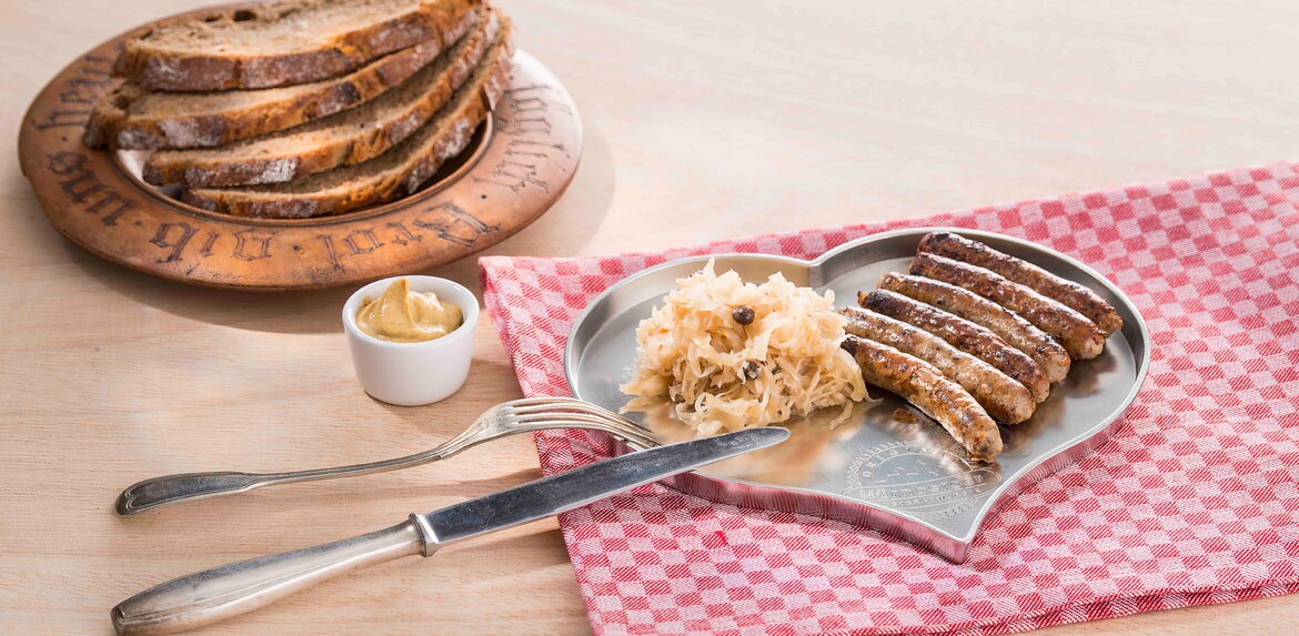 Gegrillte Nürnberger Bratwürste mit fränkischem Sauerkraut und Holzofenbrot
