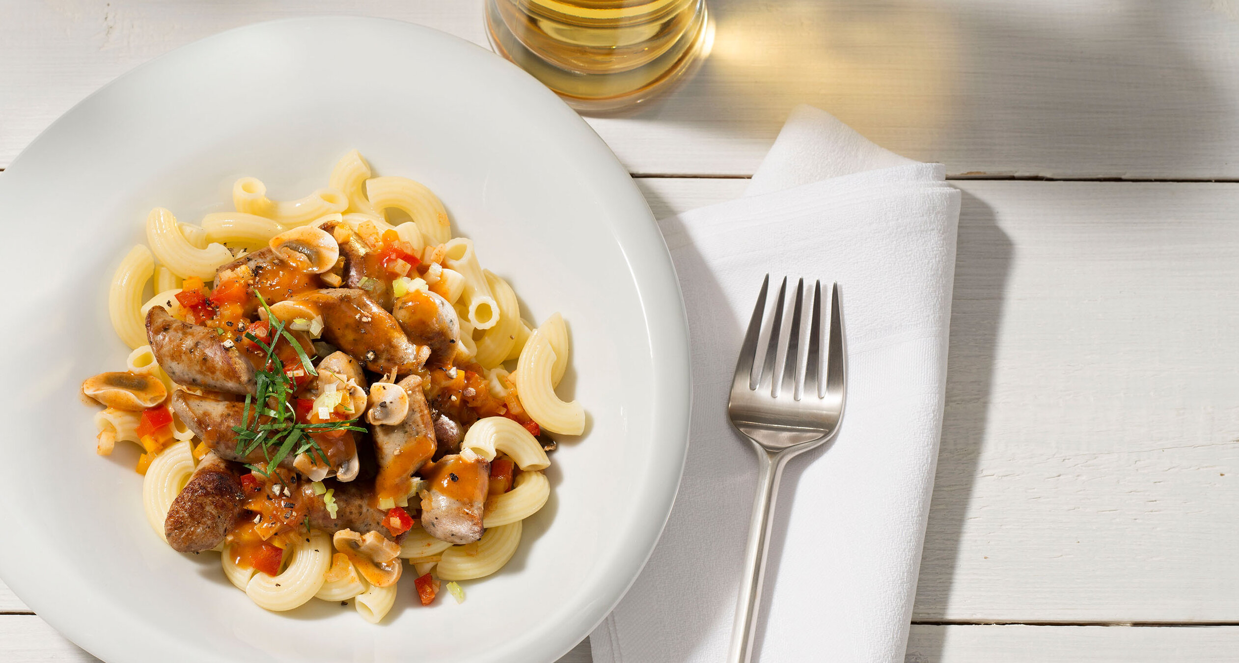 Gulasch von Nürnberger Rostbratwürsten mit Nudeln