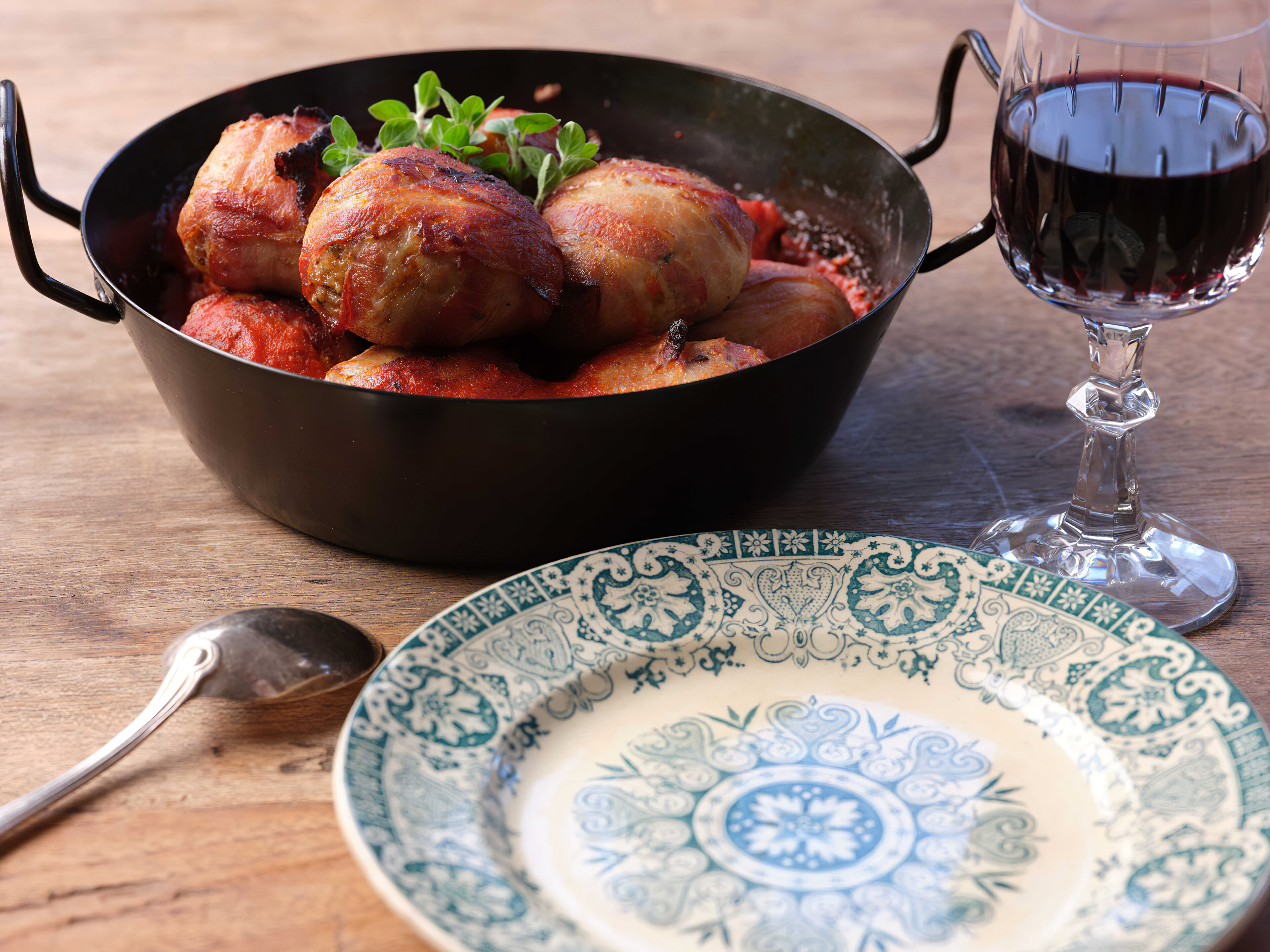 - Jeweils 3 Scheiben Speck sternförmig übereinanderlegen. Aus der Brätmasse 8 gleichmäßige Pflanzerl formen, in die Mitte einen Würfel Käse legen und zur Kugel formen. Diese mittig auf den Speck legen und alle 6 Enden nach oben falten.