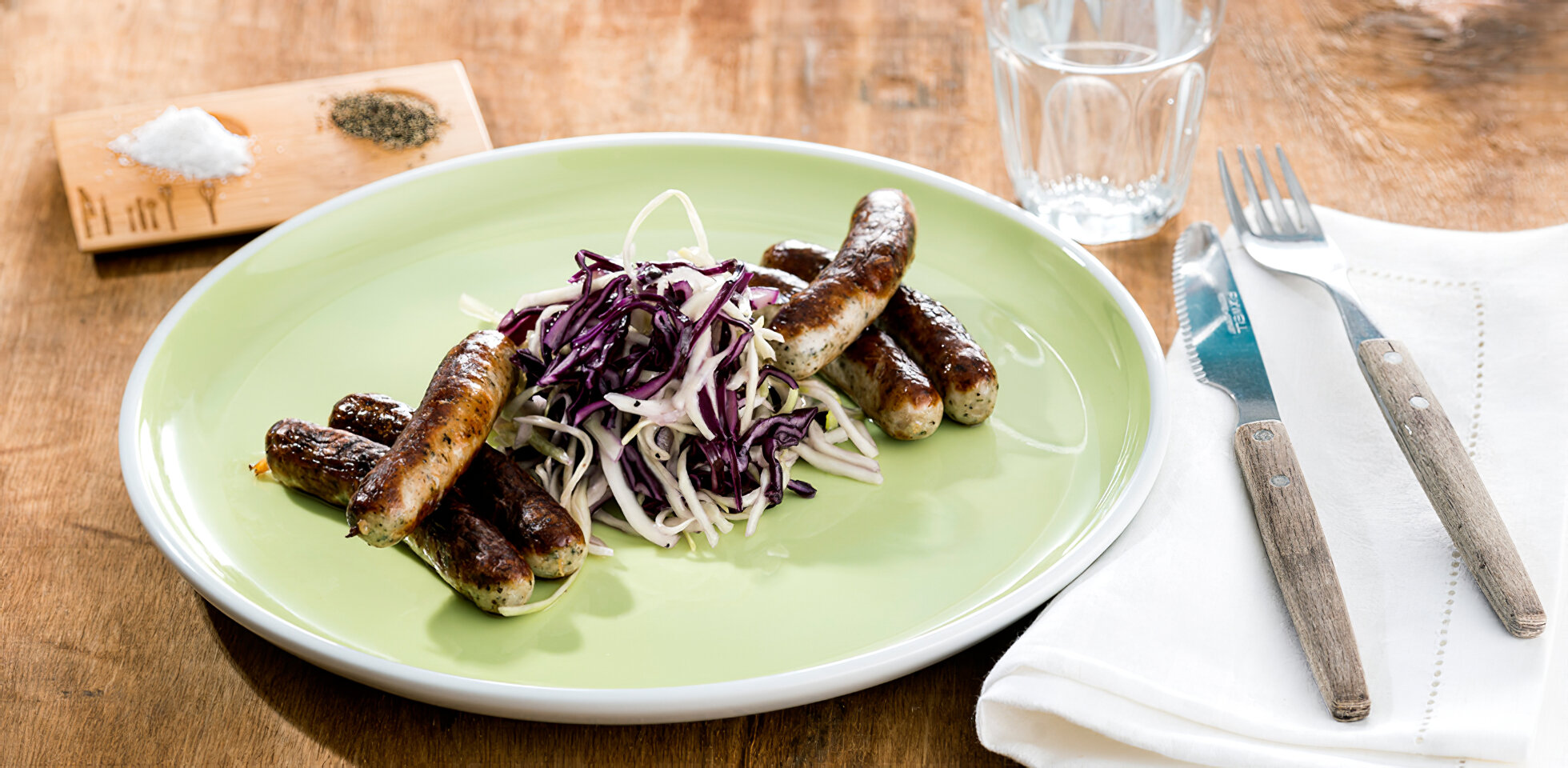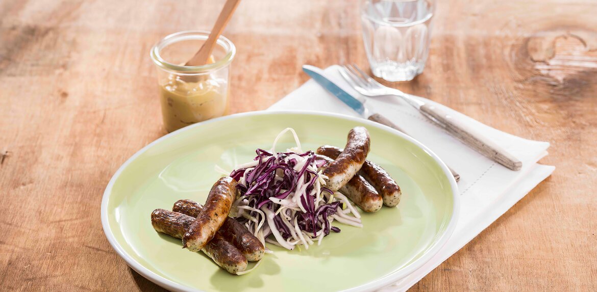 Rot-weisser Krautsalat mit Nürnberger Bratwürsten