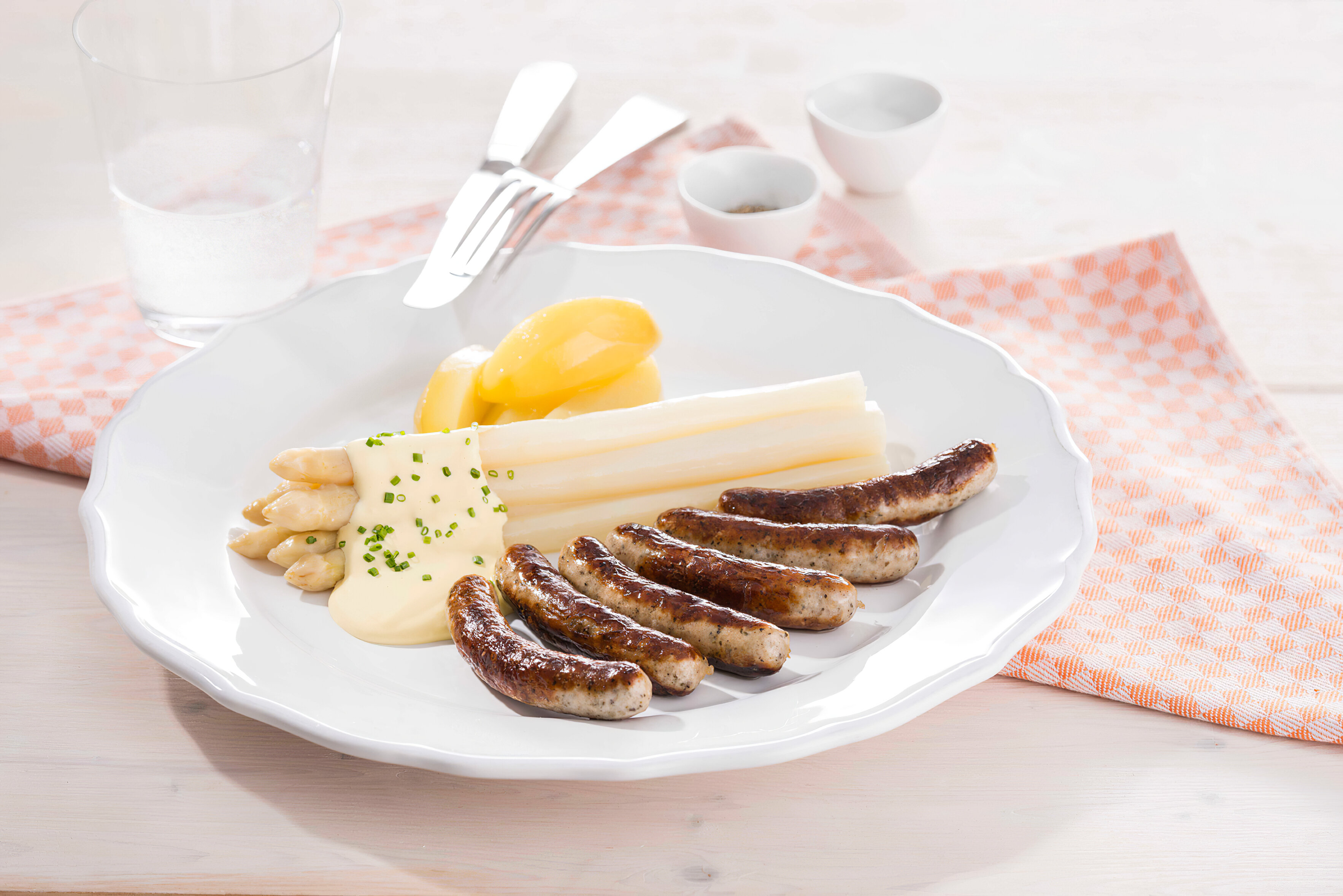 Fränkischer Spargel mit Sauce Hollandaise, Kartoffelgratin und gegrillte Nürnberger Rostbratwürste